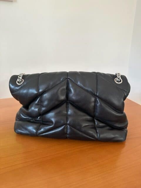 Saint Laurents chic puffer bag in size medium can be worn as an every day bag as it fits the essentials like wallet, sunglasses, phone, charger and a make up pouch and many more things.